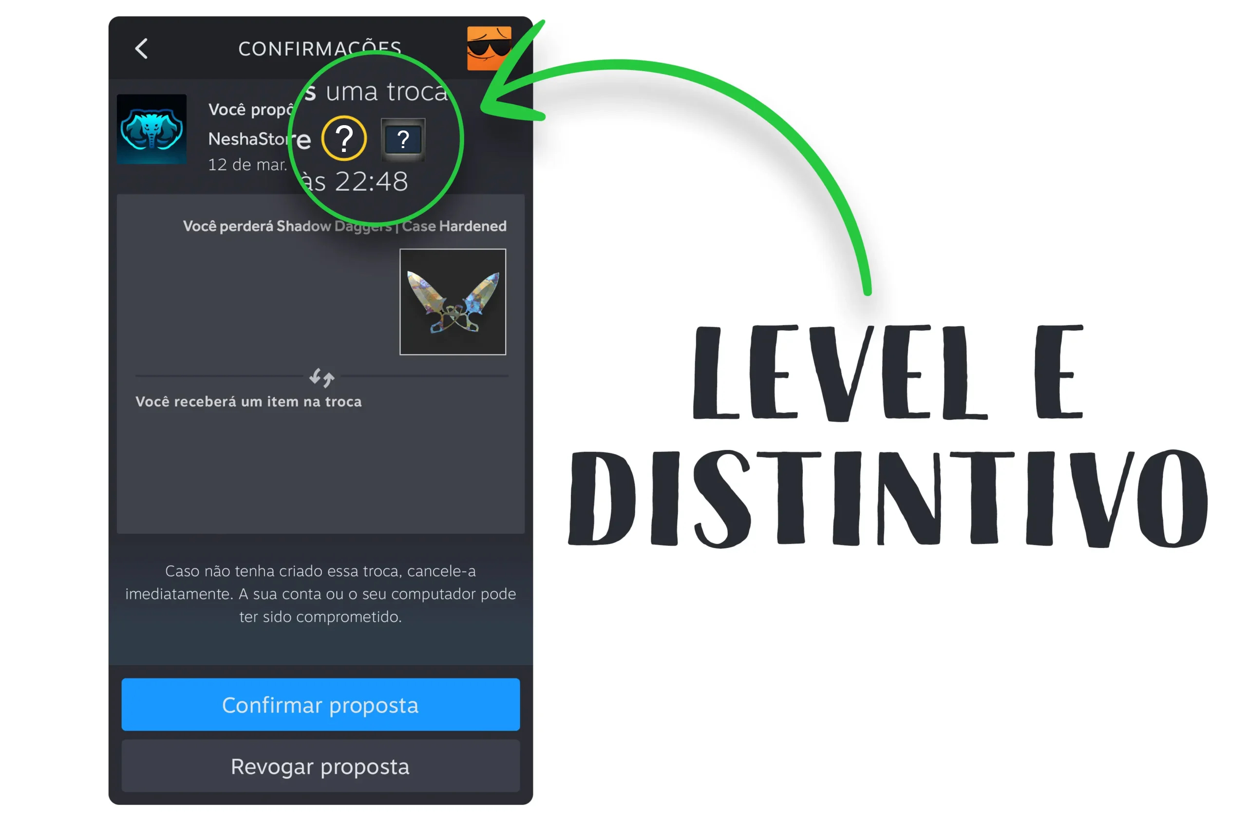 Ação: Confirme se o nível do Steam e o emblema na confirmação da troca são idênticos aos do perfil do trader pretendido.